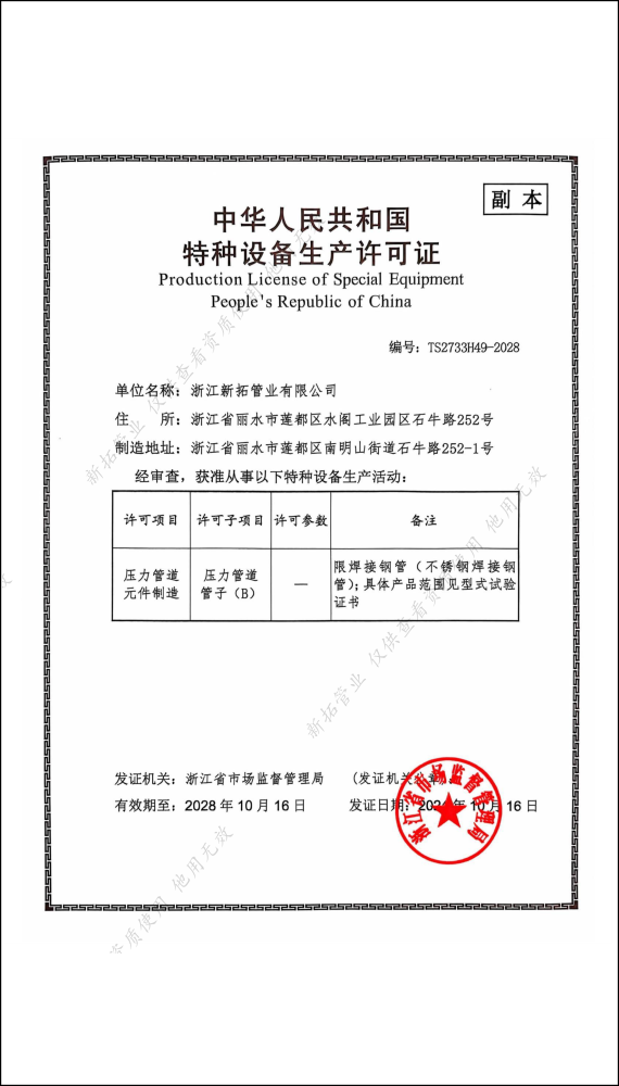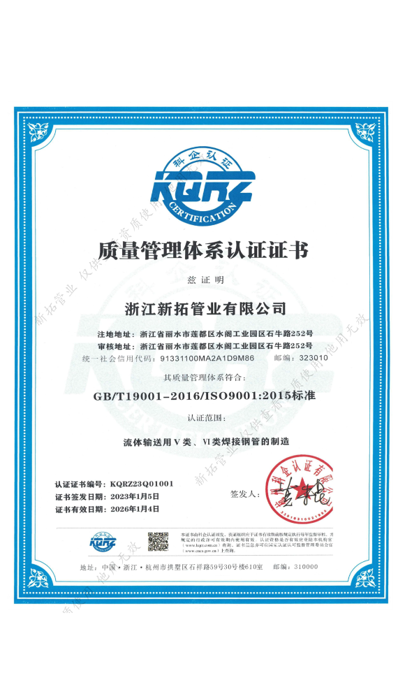 新拓管业始终坚持“创新不止,合作共赢”的理念,依靠科技进步,不断提升生产效率和产品质量。为确保产品质量,公司已通过ISO9001:2000质量管理体系认证及压力管道元件生产许可认证等国家和国际认证。为满足出口需求,公司还取得了PED和AMSE认证。凭借卓越的品质和高性价比,我们的产品在国内市场广受好评,应用于多个重点工程,同时也深受海外客户青睐,产品远销东南亚、欧美等地区。