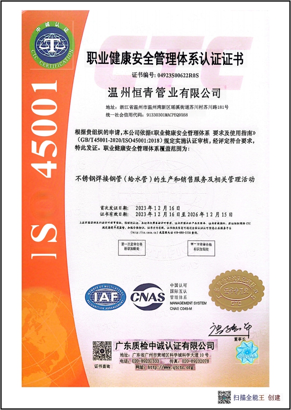 温州恒青管业有限公司专业生产不锈钢焊管、方管卫生级焊管、矩形管等。公司自成立以来,注重产品质量检验、生产工艺程序化建设,严格执行4S管理程序组织,管理组织环环相扣,严格把关产品质量,能更好的做到给用户“一个承诺”,凭着公司的宗旨及优质的产品质量和完善的售后服务,以及良好的诚信经营方式,受到了国内外客户的青睐。
